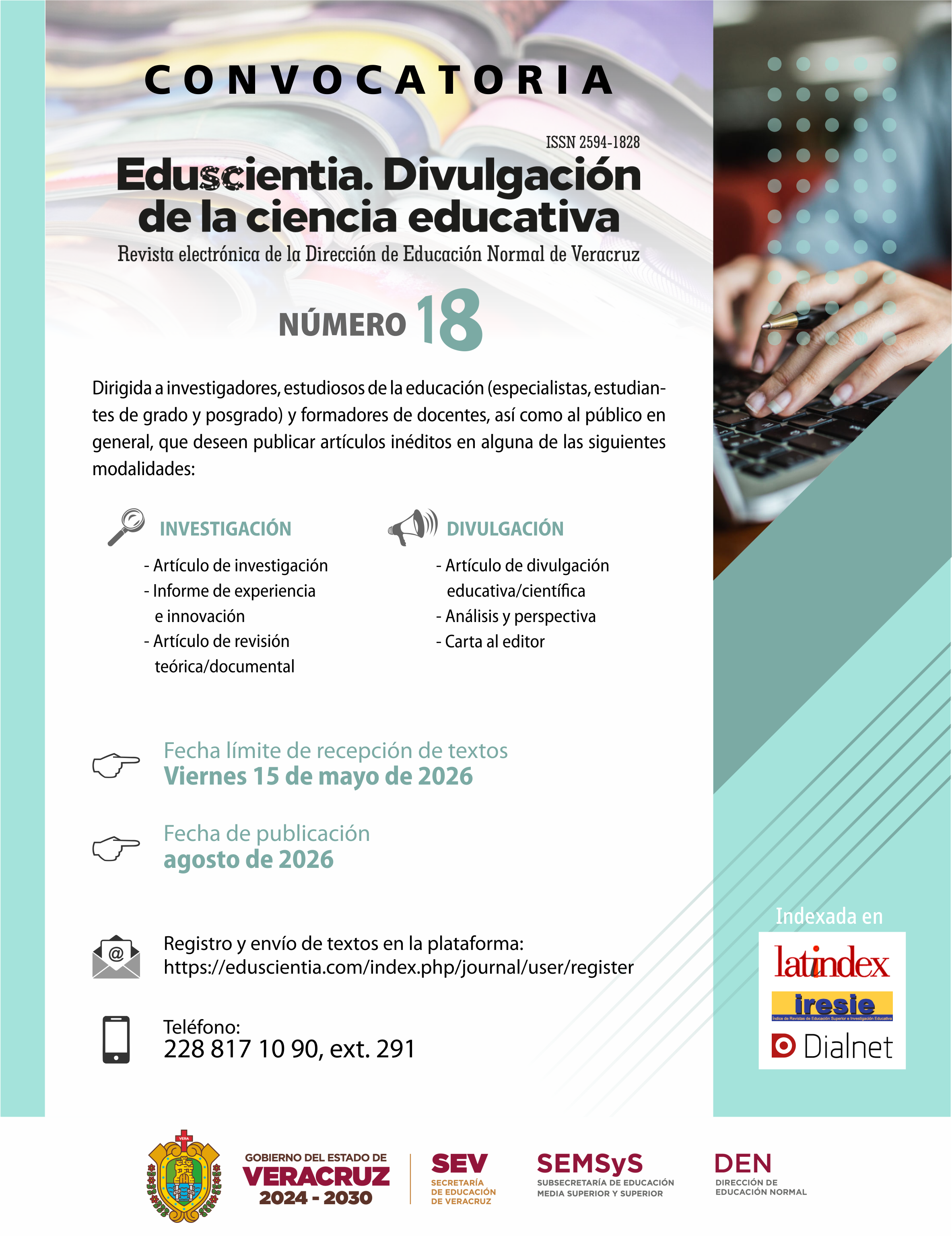 Eduscientia. Divulgación de la ciencia educativa, Year 4, No. 7, February/July 2021, is a biannual publication edited by the Secretaría de Educación de Veracruz, through the Dirección de Educación Normal, Rio Tecolutla, 33, Cuauhtémoc, ZIP Code 91069, Xalapa, Veracruz, Mexico, telephone number. (228) 8171090, www.eduscientia.com, electronic mail eduscientia.divulgar@gmail.com Editor in charge: Santa Margarita Pérez Arias. Reserves of Rights for Exclusive Use 04-2017-072810155600-203, granted by Instituto Nacional del Derecho de Autor. ISSN 2594-1828. Responsible for the last update of this issue: Julio César Munguía Hernádez, Río Tecolutla, 33, Cuauhtémoc, C.P. 91069. Date of last modification: February 26, 2021.